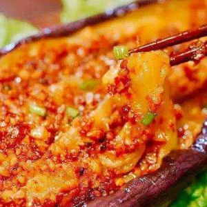 将烤好的茄子从中间划开,用筷子拨平后放入蒜蓉,再放上炒好的肉酱。