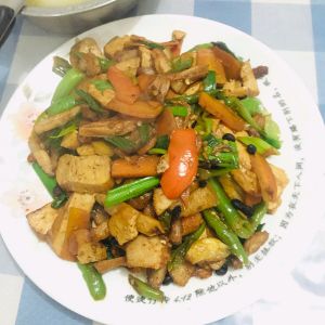 将青椒、蒜苗头,胡萝卜放入锅内炒,炒好加入豆干,一起炒。再加入炒好的肉,放入少许水,闷煮一会儿,调好自己喜欢的味道,可以勾点稀稀的芡,最后加入蒜苗。
