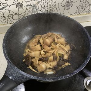 加入酱油、料酒、啤酒、开水,大火烧开,加入笋干,改中火炖;水烧去一半时,加入木耳,加入盐、糖、醋,继续中火炖;
