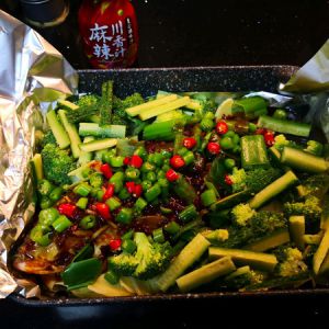锡纸铺在烤盘上刷油,码上洋葱土豆西兰花放上鱼撒点盐料酒姜丝葱叶