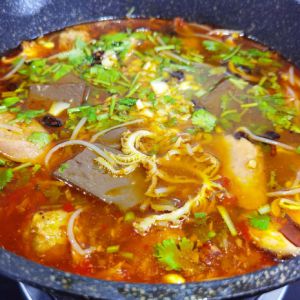 加一大勺生抽和一勺蚝油,盖上锅盖煮开,放入毛肚,十五秒关火撒上葱蒜粒,胡椒粉