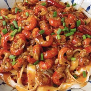 将面条煮熟捞入盘中,盛上小龙虾拌匀开吃~
