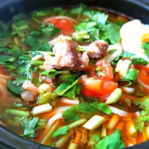 在碗中舀入适量炖好的浓汤,摆上鸡蛋,撒上葱和香菜