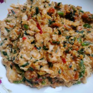 第二步在锅中放油预热后,把蒜,洋葱,青椒,放锅中翻炒。在加一勺酱油翻炒均匀。随后放鸡蛋在加点水翻炒下~