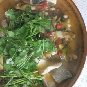 鱼煮好了,加入刚捞起来的酸菜料。倒入锅中搅拌在煮一分钟。起锅倒入准备好的碗中。
