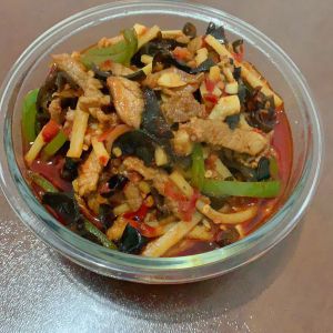 加入蒜碎➕红油豆瓣酱炒一下,加入笋丝➕青椒丝➕木耳丝,翻炒……➕少量清水,➕醋➕白糖➕生抽,不需要加盐(豆瓣酱和生抽都是咸的)