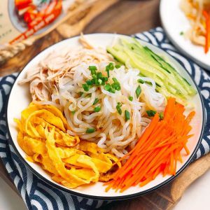 魔芋面沥干水分摆入盘中,放上鸡胸肉丝、萝卜丝、黄瓜丝、鸡蛋丝;