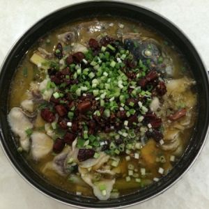 将鱼骨舀出,装入炒好的素菜盆内,汤留锅