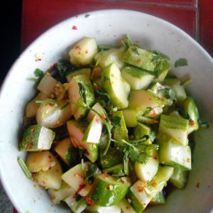 蒜剁碎,香菜切成段放入淹制的黄瓜里,加点白醋,干辣椒粉,酱油,芝麻油拌匀装盘即成。