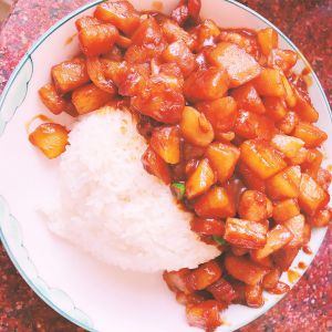 放入酱油翻炒后 倒入土豆 让土豆粘上酱油色 香味马上出来了