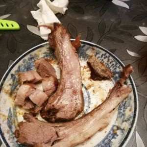 羊排出锅后夹出来,过冷水,直至羊肉冷透(不然烤完了肉会很柴,这样Q弹更好吃),过完冷水可以用厨房纸巾吸掉面上的水