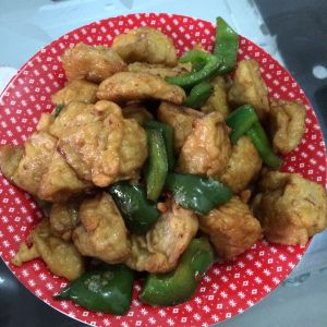 锅里留下少量油 蒜末爆香加青椒炒几下 加炸好的茄子 翻炒几下后加盐和生抽和十三香 入味了就可以盛出来了