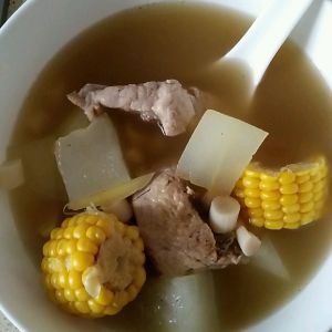 淖水后,把排骨洗净,把锅洗干净。把排骨、冬瓜、小蘑菇、玉米、姜放入锅中,一起炖。