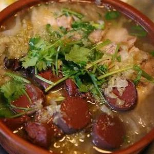 锅下少许猪油烧至6成热下姜 丝炒香再下肥猪肉、猪大肠翻炒几下加水煮熟,然后下酸菜,最后下猪血旺、猪肝、白豆腐水开滚几滚加盐味精即可出锅。