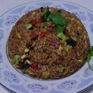 米炒散后放炒好的配料以及黄瓜丁,出锅撒小香葱放味精.