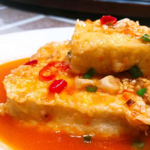 豆腐条进油锅煎炸完成起锅沥油,锅留若干底油,放入辣椒酱,豆瓣酱,蒜,盐,醋,白糖,水适量,起锅淋在豆腐条上面