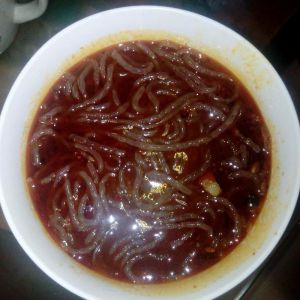 汤汁里加入酱油,鸡精,盐,多放一点醋,开锅盛入碗中,粉丝煮开,捞到碗里,加入香菜就可以了