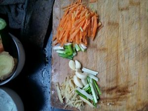 肉丝熟后加入芦蒿,胡罗卜丝,加入盐,鸡精,白胡椒粉,芝麻油