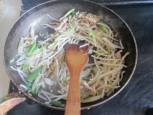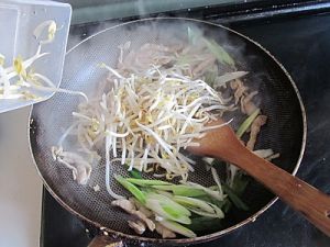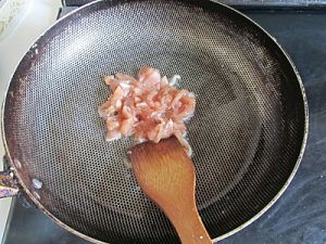 锅中放入适量的油, 下入腌好的肉丝,翻炒几下,待肉丝变色后;