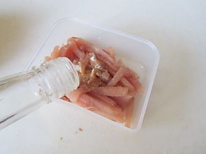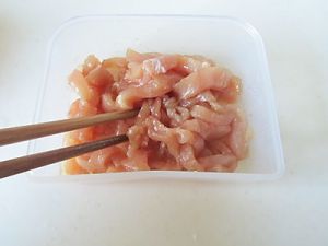 在肉丝中加入适量的盐, 料酒,生抽, 生粉和少量的油;