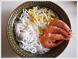 焯烫完豆芽再焯烫一下鲜虾,虾变色后捞出码放在碗内。