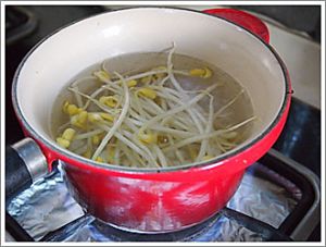小锅加水煮开,先烫散米粉捞出码放在碗内,再焯烫豆芽至软捞出。