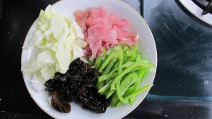 放油,下木耳,放少许水焖,水快干时,倒入青椒,包菜,一同翻炒,加入少许盐。加入七成熟猪肉和面条翻炒,即可出锅