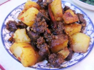 接着,倒一大碗开水至锅中煮沸后,倒入高压锅中,把土豆也放进去,看下锅里的水位,大约到食材一半左右为宜。开大火至高压锅冒气以后,转中小火再压20分钟,待气散后,即可盛盘。