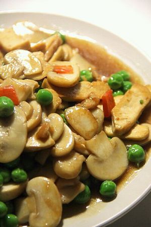 蘑菇洗净切片,可以切稍厚一些。胡萝卜切小丁,豆腐干切片,甜豌豆剥好待用。