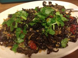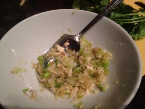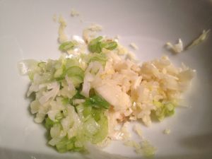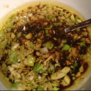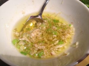 橄榄油烧制冒烟后呛入预先拌好的调料。(因为橄榄油不易高温加热太久,所以一冒烟立刻关火。)