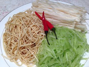分别将黄瓜,干豆腐切丝,辣椒切圈摆盘备用。