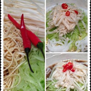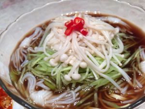 将盐,糖,陈醋,美极鲜调入一碗纯净水中拌匀放入冰箱至冷。