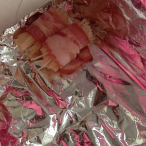 中间可以拿出来翻一两次,再刷上一层烤肉酱。烤到培根中的油都出来的差不多,肉呈熟透的红色~就可以出炉了,撒上些熟芝麻点缀即可~