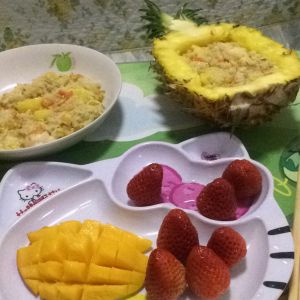 就是正常得鸡蛋炒饭,最后放菠萝在炒几下,就可以放菠萝壳里了