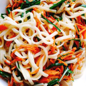 锅内倒入适量油,加热,放入葱花,爆香。倒入胡萝卜丝和韭菜段,翻炒。加入酱油,蚝油,适量盐。翻炒至均匀。