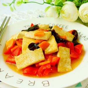 豆腐在烧的过程中,先倒入胡萝卜片,接着红椒、木耳,放入少量的水淀粉,一是汤汁更浓些,二是让豆腐味道更浓郁