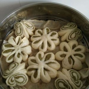 把包了抹茶面团的白面团按扁,用小刀切成花纹
