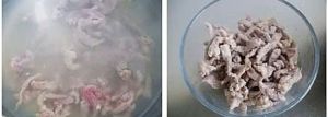 锅里加清水,烧开,放入肉丝拨散汆熟,捞出。