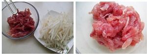 猪里脊肉切丝,放料酒、盐、淀粉,抓匀。白萝卜切丝。