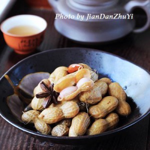 把花生放入锅里,加入几粒八角和干辣椒,倒入足够浸没花生的清水大火烧开;
