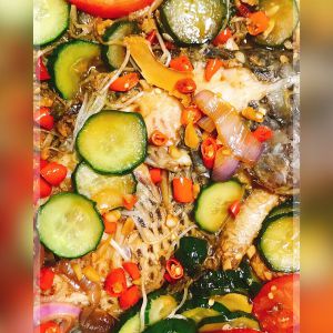 买鱼的时候,让卖鱼的帮忙杀鱼,顺便把鱼切开,但不能断。可以平煎是最好的。用盐、辣椒粉(我没有辣椒粉,就用辣椒)抹鱼的全身,放姜,料酒,腌制一两小时,用保鲜膜封好,放冰箱,天气热怕变味。