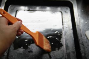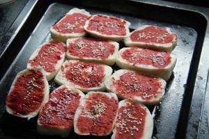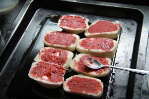 把抹好腐乳的馒头片均匀的摆放在抹好油的烤盘上面