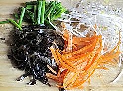 葱切断,胡萝卜和浸泡好的黑木耳切成丝备用;