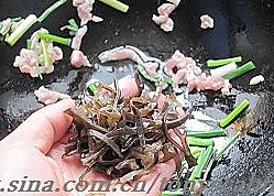放入肉丝和黑木耳煸炒片刻;