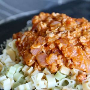 把酱盖在面条上,完成。