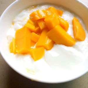 再将盖子盖上煮十分钟后关火冷却五分钟就可以勺出,冷却后切上芒果即可食用。