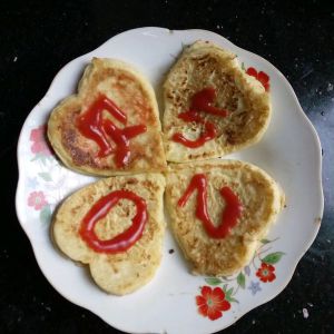 平底锅加少量油烧热,用大勺子盛一勺放到锅里(我用的是爱心煎蛋模型),等成型后翻面再煎会就可以了!