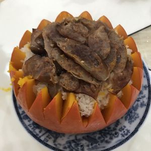 成品,腊肉香肠的油脂被析出后吸入了南瓜饭里,南瓜饭软糯香甜,带着清香。