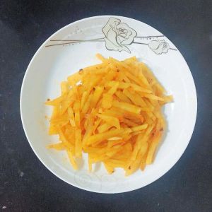 准备食材后土豆切丝泡水,抗氧化的同时泡去部分淀粉。泡的时候滴几滴白醋,这样炒完后脆脆的