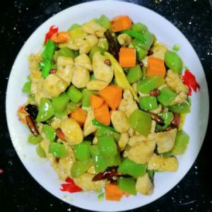 鸡脯肉切丁加盐、胡椒粉、小粉、鸡精、水、料酒腌制备用。